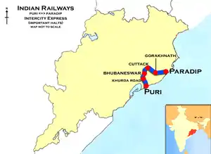 The 18413 / 14 Intercity Express is an Express train belonging to Indian Railways East Coast Railway zone that runs between Paradeep and Puri in India.[1]