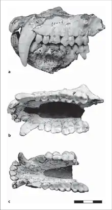Paradolichopithecus is an extinct genus of cercopithecine monkey once found throughout Eurasia. The type species, P. arvernensis, was a very large monkey, comparable in size to a mandrill. The genus was most closely related to macaques, sharing a very similar cranial morphology.[1] The fossils attributed to Paradolichopithecus are known from the Early Pliocene to the Early Pleistocene of Europe (France, Spain, Greece, Romania, and Serbia) and Asia (Tadjikistan and China).[2] The East Asian fossil genus Procynocephalus is considered by some to represent a senior synonym of Paradolichopithecus.[3]