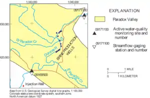 Paradox Valley is a basin located in Montrose County in the U.S. state of Colorado. The dry, sparsely populated valley is named after the apparently paradoxical course of the Dolores River—instead of flowing down the length of the valley, the river cuts across the middle.[1] The valley is the site of a Bureau of Reclamation salinity-control project which has caused thousands of earthquakes,[2] and is the proposed location of a new uranium mill which would be the first built in the United States in over 25 years.[3]