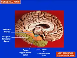 ![]() Human brain seen from below. Parahippocampal gyrus shown in blue | |