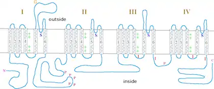 This proteins forms a sodium-selective ion channel, that relies on an electrochemical gradient.[1] The protein consists of four homology domains, HD1, HD2, HD3 and HD4. Each homology domain has six alpha helical segments, S1-S6.[6] The small alpha-helical region between S5 and S6 is known as the channel pore. Mutations within this region may be responsible for ion selectivity.[6] The cytoplasmic loop between HD3 and HD4 is responsible for fast inactivation and blocking conductance.[6] The voltage sensor 4 in HD III is partially formed by exon L and K.[7] The alternative splicing at this locus causes a difference in the charged current at this channel.[7] Exon L produces 8% of the transient current, which falls to 2% when the K exon is incorporated.[7]