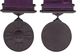 The name of the award translates as the "Wheel of the Ultimate Brave".[5] The medal is a circular bronze disc 35 millimetres (1+3⁄8 inches) in diameter. On the obverse, or front, the National Emblem of India appears in the centre on a raised circle surrounded by four copies of the vajra, the weapon of Indra, the ancient Vedic king of the gods. The motif symbolizes the sacrifice of Rishi Dadhichi, who gave his bones to the gods to make the vajra to kill the demon Vritra. The medal is suspended from a straight-swiveling suspension bar. On the reverse, around a plain centre, are two legends separated by lotus flowers. The words "Param Vir Chakra" are written in Hindi and English.[8][20] A purple ribbon, 32 millimetres (1+1⁄4 in) long, holds the Param Vir Chakra.[8]