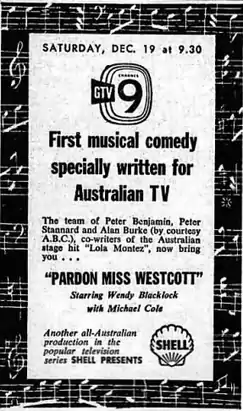 "Pardon Miss Westcott" is a 1959 Australian TV play by the Seven Network as part of drama anthology series Shell Presents. It was a musical set in colonial Australia and was broadcast live. It was Australia's first television musical comedy.[1][2][3]