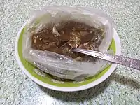 Another variation of the dish, informally known as pares kariton ("pushcart pares") or pares kanto ("street corner pares") for being served on the roadside by mobile sidecar vendors, serves the beef and broth combined, usually with the broth slightly thickened by cornstarch.[4] This variant is less sweeter and has less spices compared to the beef asado variant but is more savory due to the use of beef tendons (litid), bone marrow (utak ng buto), and fatty cuts of beef.[5]