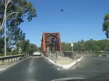 The bridge consists of a vertical-lift span 78 feet (24 m) long which can rise 30 feet (9.1 m) in one and a half minutes. There are three Pratt truss spans of 112.5 feet (34.3 m), and a plate girder span at each end.[1] It was designed by the South Australian Railways (SAR) and fabricated by Perry Engineering of Adelaide. It opened on 31 January 1927.[2][3] It was built as a road-rail bridge with both the Sturt Highway and Barmera railway lines using the same reservation.[4] Maintenance cost were shared equally between the SAR and Highways department.[5]