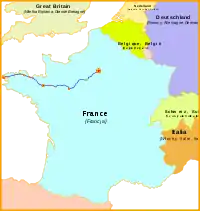 The railway Paris–Brest was first built and exploited by the Chemins de Fer de l'Ouest.[4] The oldest section of the line is the part between Paris and Viroflay, built in 1840 as part of the railway between Paris and the city of Versailles. The part between Viroflay and Chartres was opened in 1849, Chartres–La Loupe in 1852, La Loupe–Le Mans in 1854, Le Mans–Laval in 1855, Laval–Rennes in 1857, followed by Rennes–Guingamp in 1863 and Guingamp–Brest in 1865.[3]