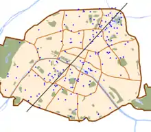The Paris gun was used to shell Paris at a range of 120 km (75 mi).[9] The gun was fired from a wooded hill (Le mont de Joie) near Crépy, and the first shell landed at 7:18 a.m. on 23 March 1918 on the Quai de la Seine, the explosion being heard across the city. Shells continued to land at 15-minute intervals, with 21 counted on the first day.[10] On the first day, fifteen people were killed and thirty-six wounded.[9] The effect on morale in Paris was immediate: by 27 March, queues of thousands had started at the Gare d'Orsay and, at the Gare Montparnasse, ticket sales out of the capital were suspended due to demand.[9]