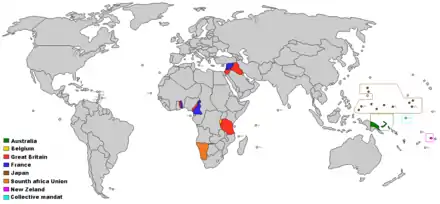 The second category, of New Guinea, Samoa, and South West Africa, were located so close to responsible supervisors that the mandates could hardly be given to anyone except Australia, New Zealand, and South Africa. Finally, the African colonies would need the careful supervision as "Class B" mandates, which could be provided only by experienced colonial powers: Britain, France, and Belgium although Italy and Portugal received small amounts of territory. Wilson and the others finally went along with the solution.[12] The dominions received "Class C Mandates" to the colonies that they wanted. Japan obtained mandates over German possessions north of the Equator.[13][14][15]