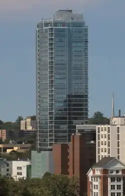 The first sales for units in the building were finalized on September 18, 2009, while the first tenants began moving in over the next two days. Other new residents were expected to move in over the following few months. The lowest floors were to be occupied first. The project featured 170 units, of which 70 were under contract. Two of the project's six penthouses had been sold up to that time. Amenities included a 24-hour concierge desk, a billiards room, a gym, a lounge, a pool, and a rooftop deck. The ground floor featured a 3,500 sq ft (330 m2) area designed to accommodate a restaurant and bar, but a tenant had yet to occupy the space.[5] The structure, made of glass, was the tallest building in Stamford at the time of its opening, standing 350 feet with 34 floors.[5][50]