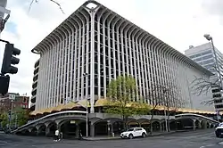 The Parkade Plaza—also known locally as The Parkade—is an 11-level public parking garage Spokane, Washington. It was built for $3.5 million in 1967 by Sceva Construction Company, with concrete furnished by the Acme Concrete Company.[3] The structure was built to accommodate one thousand automobiles and achieved its record capacity on December 22, 1969, with 3878 cars, well beyond the 1967 capacity needs.[4] The architect for the project was Warren C. Heylman, who was also responsible for other notable works in and around Spokane including the Spokane Regional Health Building, the Riverfalls Tower Apartments, the original terminal of the Spokane International Airport, and the public library in Colfax, Washington.[5] The Parkade is notable for its connection to the Spokane skywalks and won an award for 'excellence in use of concrete' in 1968 that was presented directly to Warren C. Heylman.[6]