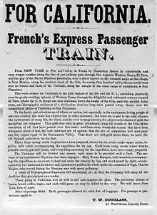 French and his wife arrived in New York City about the beginning of 1850. Daughter Matilda Strong French was born there in February.[15][16] Before long, French – having granted himself the rank of "Captain" – had taken an office in the Tammany Building,[17] had placed ads in the newspapers, and had flyers printed describing his plan to lead an expedition to the gold fields of California for a fee of $250.[18] One flyer began,