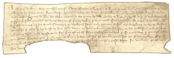 Isabella, Mortimer and the lords arrived in London on 4 January 1327.[50] In response to the previous year's spate of murders, Londoners had been forbidden to bear arms, and two days later all citizens had sworn an oath to keep the peace.[52] Parliament met on 7 January to consider the state of the realm now the King was incarcerated. It had originally been summoned by Isabella and the Prince, in the name of the King, on 28 October the previous year. Parliament had been intended to assemble on 14 December 1326, but on 3 December—still in the name of the King[note 9]—further writs were issued deferring the sitting until early the next year. This, it was implied, was due to the King being abroad, rather than imprisoned.[9] Because of this, parliament would have to be held before the Queen and Prince Edward.[54] The History of Parliament Trust has described the legality of the writs as being "highly questionable",[9] and C. T. Wood called the sitting "a show of pseudo-parliamentary regularity",[55][note 10] "stage-managed" by Mortimer and Thomas, Lord Wake.[56] For Isabella and Mortimer, governing through parliament was only a temporary solution to a constitutional problem, because at some point their positions would likely be challenged legally.[50] Thus, suggests Ormrod, they had to enforce a solution favourable to Mortimer and the Queen, by any means they could.[54]