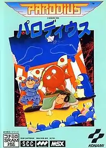 Parodius: The Octopus Saves the Earth (パロディウス ~タコは地球を救う~, Parodiusu: Tako wa Chikyū o Sukū), or referred to as just Parodius, is a scrolling shooter video game developed by Konami for the MSX computer and was released in Japan. The game is notable for being the first title in the Parodius series, although it is often confused with its sequel Parodius! From Myth to Laughter. The name itself is a portmanteau of "Gradius" and "Parody" and, eponymously, the game is a parody of the Gradius series of space-based horizontally scrolling shooters. Many of the characters and enemies are derived from that famous shooter series, while other elements are extracted from other Konami titles, such as Antarctic Adventure and TwinBee. This game is of particular note in the series as being heavily infused with Japanese culture and folklore.