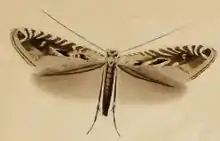 The wingspan is about 10 mm. The head is whitish, mixed with fuscous. Palpi white. Forewings are dark fuscous, towards base irrorated with white: numerous costal strigulae, a spot in disc posteriorly, and two dorsal spots preceded by blackish spots white; a black apical spot, anteriorly white-margined; cilia with three entire dark fuscous lines. Hindwings are grey. The larva is pale yellow-green; dorsal line dark green or red-brown; head pale brown; segment 2 with four black spots.[2]
