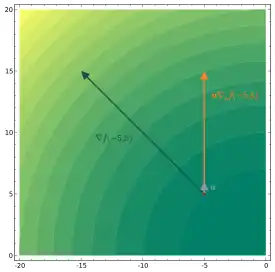 A contour plot of , showing the gradient vector in black, and the unit vector scaled by the directional derivative in the direction of in orange. The gradient vector is longer because the gradient points in the direction of greatest rate of increase of a function.