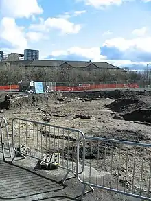 The castle's remains are likely to lie under the south-western end of the Tesco development site in Partick.[7] The site was most recently a scrapyard but before that a dye-works, a foundry and a laundry. Unlike most of the old village of Partick, the castle's site was not removed by the excavations involved in the construction of the now disused Partick Central railway station. Rather, the castle site's solum was preserved under the aforementioned industrial buildings. As part of Scottish Water's Glasgow environmental improvement programme, part of the castle was uncovered & excavated by GUARD Archaeology.[8]