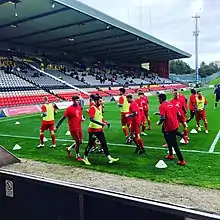 Firhill has been used by other football teams and for rugby over the years. Between 1986 and 1991 Clyde ground shared with Thistle,[79] following their eviction from Shawfield.[80] Hamilton Academical also ground shared for two spells over seven years,[81] following them being forced out of Douglas Park in 1994. In December 2005, Firhill also became the home of Glasgow's professional rugby union team, Glasgow Warriors, when they moved from their previous base at Hughenden Stadium. After returning to Hughenden in 2006, the Warriors took up a two-year residency at Firhill from the start of the 2007–08 Celtic League season.[82] This was extended in April 2009 for a further five years.[83][84] Glasgow Warriors left Firhill after the 2011–12 season and moved to Scotstoun Stadium.[85][86] During the 2012–13 season the ground was also used by Celtic's under-20 squad as their home ground,[87] but following Thistle's promotion this stopped for the 2013–14 season.[88]