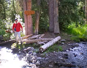 Parting of the Waters is an unusual hydrologic site at Two Ocean Pass on the Great Divide, within the Teton Wilderness area of Wyoming's Bridger-Teton National Forest. Two Ocean Pass separates the headwaters of Pacific Creek, which flows west to the Pacific Ocean, and Atlantic Creek, which flows east to the Atlantic Ocean. At Parting of the Waters, at 44°02.571′N 110°10.524′W,[2] North Two Ocean Creek flows down from its drainage on the side of Two Ocean Plateau in and divides its waters more-or-less equally between its two distributaries, Pacific Creek and Atlantic Creek. From this split, Two Ocean Creek waters flow either 3,488 miles (5,613 km) to the Gulf of Mexico via Atlantic Creek and the Yellowstone, Missouri and Mississippi Rivers, or 1,353 miles (2,177 km) to the Pacific via Pacific Creek and the Snake and Columbia Rivers. In the marshy area of Two Ocean Pass adjacent to Parting of the Waters, water actually covers the Continental Divide such that a fish could swim from the Pacific Ocean to the Atlantic Ocean drainages. In fact, it is thought that this was the pass that provided the route for Yellowstone cutthroat trout to migrate from the Snake River (Pacific) to Yellowstone River (Atlantic) drainages.[3][4]