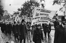 The Unionist governments of Northern Ireland were accused of discrimination against the Irish nationalist and Catholic minority. A non-violent campaign to end discrimination began in the late 1960s. This civil rights campaign was opposed by loyalists, who accused it of being a republican front to bring about a united Ireland.[7] This unrest led to the August 1969 riots and the deployment of British troops, beginning a thirty-year conflict known as the Troubles (1969–98), involving republican and loyalist paramilitaries.[96][97] In 1973 a 'border poll' referendum was held in Northern Ireland on whether it should remain part of the UK or join a united Ireland. Irish nationalists boycotted the referendum and only 57% of the electorate voted, resulting in an overwhelming majority for remaining in the UK.[98]