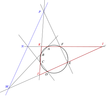 A degenerate case of Pascal's theorem (four points) is interesting; given points ABCD on a conic Γ, the intersection of alternate sides, AB ∩ CD, BC ∩ DA, together with the intersection of tangents at opposite vertices (A, C) and (B, D) are collinear in four points; the tangents being degenerate 'sides', taken at two possible positions on the 'hexagon' and the corresponding Pascal line sharing either degenerate intersection. This can be proven independently using a property of pole-polar. If the conic is a circle, then another degenerate case says that for a triangle, the three points that appear as the intersection of a side line with the corresponding side line of the Gergonne triangle, are collinear.