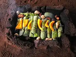 Traditional foods include umu, meat, fish, vegetables and fruit wrapped in banana leaves and roasted in umu pae – an earth oven. Po'e, pudding made of mashed bananas, pumpkin and flour is baked in the umu pae as well.[1] Other favorite dishes are tunu ahi, fish grilled on hot stones, or ceviche. Pascuense cuisine also includes meat dishes, such as pork or mutton ribs.[2]