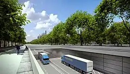 The freeway consists of four lanes, and is for trucks and long-distance buses exclusively, with eight lanes on parallel streets for light vehicles (four on each side, northbound and southbound).[2] It was inaugurated on May 27, 2019.[4]