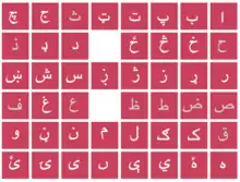 | ﺍ ﺏ پ ﺕ ټ ﺙ ﺝ چ ﺡ ﺥ څ ځ ﺩ ډ ﺫ ﺭ ړ ﺯ ژ ږ ﺱ ﺵ ښ ﺹ ﺽ ﻁ ﻅ ﻉ ﻍ ﻑ ﻕ ک ګ ﻝ ﻡ ﻥ ڼ ﻭ ه ۀ ي ې ی ۍ ئ |