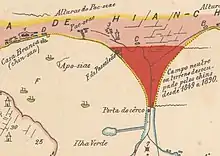 - "Pak Shan Lan", "Pak-sa-leang" or "Pac-sa-leong" are renderings of the Cantonese pronunciation of 白沙岭, Mandarin "Baishaling". According to Carlos Augusto Montalto, the Portuguese called the battlement Passaleão.[1] The current name for the hill on which the ruins of the fort are located is Paotaishan (Chinese: 炮台山). Actual Baishaling (白沙岭) is a mountain ridge several kilometers north of Paotaishan.