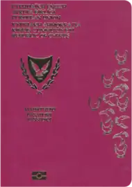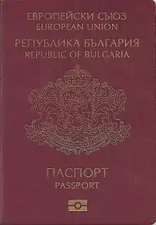 The European Union itself does not issue ordinary passports, but ordinary passport booklets issued by its 27 member states share a common format.[1] This common format features a coloured cover (for which burgundy is compulsory : all countries except Croatia follow this recommendation) emblazoned—in the official language(s) of the issuing country (and sometimes its translation into English and French)—with the title "European Union", followed by the name(s) of the member state, the heraldic "Arms" of the State concerned, the word "PASSPORT", together with the biometric passport symbol at the bottom centre of the front cover.[2]