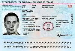On the top of the identification page there is the code "P" for passport, the code (ISO 3166-1 alpha-3) for the issuing country, and the passport number. On the left side there is the main photo. On other places there might optionally be the passport holder's height and security features, including a smaller, see-through photo.
