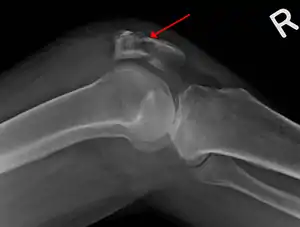 It typically results from a hard blow to the front of the knee or falling on the knee.[1] Occasionally it may occur from a strong contraction of the thigh muscles.[1] Diagnosis is based on symptoms and confirmed with X-rays.[3] In children an MRI may be required.[3]