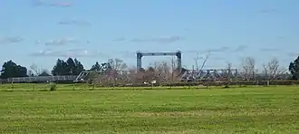 Hinton bridge is an Allan-type timber truss road bridge. It has two external timber truss spans, each of 28 metres (92 ft) and one internal steel truss lift span of 17.8 metres (58 ft). There are seven timber approach spans at one end and three at the other giving the bridge an overall length of 178.6 metres (586 ft).[1]