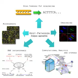 Pathogenomics is a field which uses high-throughput screening technology and bioinformatics to study encoded microbe resistance, as well as virulence factors (VFs), which enable a microorganism to infect a host and possibly cause disease.[1][2][3][4] This includes studying genomes of pathogens which cannot be cultured outside of a host.[5] In the past, researchers and medical professionals found it difficult to study and understand pathogenic traits of infectious organisms.[6] With newer technology, pathogen genomes can be identified and sequenced in a much shorter time and at a lower cost,[7][8] thus improving the ability to diagnose, treat, and even predict and prevent pathogenic infections and disease.[9] It has also allowed researchers to better understand genome evolution events - gene loss, gain, duplication, rearrangement - and how those events impact pathogen resistance and ability to cause disease.[8] This influx of information has created a need for making the vast amounts of data accessible to researchers in the form of databases,[10] and it has raised ethical questions about the wisdom of reconstructing previously extinct and deadly pathogens in order to better understand virulence.[11]