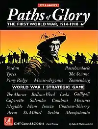 Paths of Glory: The First World War, 1914–1918 is a strategy board wargame, designed in 1999 by the six-time Charles S. Roberts Awards winner Ted Raicer and published by GMT Games. It covers World War I from its outbreak to the 1918 Armistice, or based on the progress of the game a hypothetical later ending of the war in early 1919, possibly due to exhaustion of Europe. The game is played on a map of Europe and the Middle East as the game board.