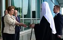 Kirill is greeted by Brazilian President Dilma Rousseff as he arrives at the Alvorada Palace in Brasilia, Brazil, 19 February 2016