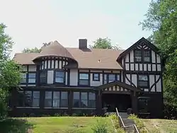 The Tudor Revival style residence sits high on a hill above Marquette Street. The first story is covered in dark red face brick, and the second and third floors sport the half-timbering for which the architectural style is known. Another architecture feature is that the upper floors protrude above the floor below. The semi-circular bay is another defining feature.