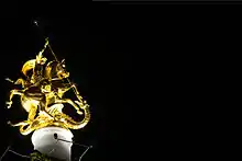 In Mons (Belgium),[33] Saint George is honoured each year on Trinity Sunday. In the heart of the city, a reconstitution (known as the "Combat dit Lumeçon") of the fight between Saint George and the dragon is played by 46 actors.[34] According to the tradition, the inhabitants of Mons try to get a piece of the dragon during the fight. This will bring luck for one year to the ones succeeding in this challenge. This event is part of the annual Ducasse festival and is attended by thousands of people.