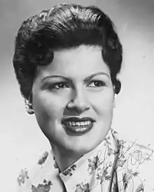 In August 1953, Cline was a contestant in a local country music contest. She won 100 dollars and the opportunity to perform as a regular on Connie B. Gay's Town and Country Time.[28] The show included country stars Jimmy Dean, Roy Clark, George Hamilton IV and Billy Grammer,[17] and was filmed in Washington D.C. and Arlington, Virginia. She was not officially added to the program's television shows until October 1955.[29] Cline's television performances received critical acclaim. The Washington Star magazine praised her stage presence, commenting, "She creates the moods through movement of her hands and body and by the lilt of her voice, reaching way down deep in her soul to bring forth the melody. Most female country music vocalists stand motionless, sing with monotonous high-pitched nasal twang. Patsy's come up with a throaty style loaded with motion and E-motion."[30]