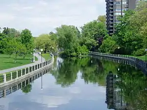 Patterson Creek is a small body of water in the middle of Ottawa, Ontario. The creek was originally a small stream flowing east through a swampy area to the Rideau River. The construction of the Rideau Canal blocked the creek causing it to become much larger in size. Prior to the construction the land housed a Cedar Lodge. The construction created a small island in the creek that then housed the Cedar Lodge, but this structure was demolished in the 1930s. The Creek originally ran from near Lyon Street all the way to the canal. The creek was named after George Patterson, an early settler who owned the lot where the creek emptied into the canal. In the 1890s work began on landscaping the area. The western portion of the creek disappeared, replaced by Central Park in one of the first projects of the Ottawa Improvement Commission.