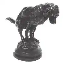 As early as December 1869 his sculptures had begun to be imported to the United States by the Philadelphia jewelry firm of J. E. Caldwell & Co. who had a store at 902 Chesnut Street. The store also advertised works by Jean-Louis Grégoire, Carrier, Moigniez, Mêne, and others.[7] Delabrièrre portrayed realism in nearly all his sculptures. His circa 1870 bronze of a dog defecating took realism to an extreme level and was unusual if not outright strange. The subject matter was likely detrimental to the sales of the sculpture;[6] however, it did possess certain qualities as a conversation piece. Bronzes by Delabrièrre and fellow animalier and countryman Jules Moigniez were popular in Britain and the United States in the late 19th century.