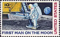In 1962, Calle was among the first group selected to participate in the NASA Art Program. Calle contributed a pair of complementary five-cent stamps issued in 1967 as part of the Accomplishments in Space Commemorative Issue, with the right stamp showing the Gemini 4 space capsule with the Earth's horizon as a backdrop, while the left stamp showed astronaut Ed White making the first American spacewalk.[1][2] His best-known stamp was designed to mark the first human moon landing and was issued in September 1969, showing an astronaut stepping out onto the surface of the moon.[1] The Apollo 11 crew carried with them a die proof of Calle's moon-landing stamp, which was hand canceled by the astronauts while on the mission.[1][3] Calle had been given exclusive access to be with the astronauts on July 16, 1969, while they made their final preparations for the Apollo 11 mission.[1] The sketches he made based on his experiences that day have been displayed at the National Air and Space Museum and at the National Gallery of Art.[4] Together with his son Chris, Calle returned to the subject of space exploration with a pair of stamps issued in 1994 in honor of the 25th anniversary of the Apollo 11 mission and the first human moon landing.[1]