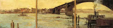 Born in St. Louis, Missouri, Cornoyer began painting in Barbizon style, trained at the St. Louis School of Fine Arts,[1] and first exhibited in 1887. In 1889, he continued his studies in Paris at the Académie Julien with Jules Lefebvre, Louis Blanc and Benjamin Constant.[2] While Cornoyer was in Paris, he also traveled to London and Venice. This period exposed him to French Impressionism, which was reflected in a more fluid, tonal and lyrical style in his later landscapes and cityscapes. Cornoyer's interpretation of impressionism was more conservative than his French counterparts, leaving his work with a distinctly American sensibility.