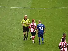 Scholes experienced one of his finest seasons in 2006–07,[39] and was included in the PFA Team of the Year,[40] and was shortlisted for the PFA Players' Player of the Year.[41] One of his finest performances of the season came in a 4–1 win against Blackburn Rovers, where United were 1–0 down but Scholes "got hold of the game by the scruff of the neck" and scored the equalising goal.[42][43] Scholes was dismissed during United's 1–0 away victory over Liverpool on 3 March 2007 for swinging an arm at Xabi Alonso.[44] It marked his first league sending off since April 2005.[45] A month later, he was sent off in the first leg of United's Champions League quarter final at Roma.