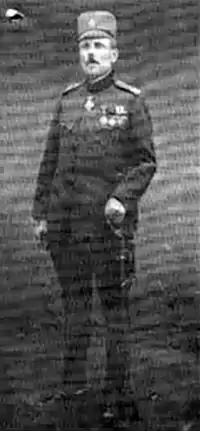 In the First Balkan War, Blažarić was the commander of the Lukovo Chetnik Detachment which liberated the Christian population of Pristina from the Ottoman Turks in 1912. In the Second Balkan War, he was the commander of the Third Volunteer Brigade (Dobrovoljačka Brigada).[3] In the Great War, he was appointed the commander of the 3rd Border Section with the task of preventing Albanian Kachaks and Bulgarian Komitadji (sponsored by IMRO/VMRO) from entering Serbia. He then joined the Serbian army's retreat through Albania from late 1915 to 1916 and participated in the fighting on the Salonika front. After the wars, he carried out various military duties as head of the Prizren Military District until 1926, when he took his retirement.