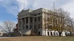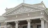 Its more elaborate and prominent feature is a monumental four-column entry portico on its north, front facade. The four columns have complex capitals, and there are squared pilasters behind the end columns. The portico has a pair of stairways leading up to it, and a pediment above including figurative sculpture. The pedimental sculpture is described in its 1989 NRHP nomination as "A rather delicate feature".[2] It is described as having: