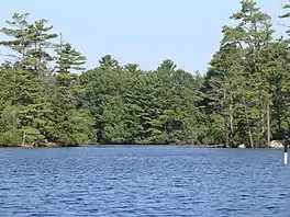 Beginning in 1825 the Newmarket Manufacturing Company began to acquire land in the area for the construction of a reservoir to supply a consistent source of water power to its textile mill in nearby Newmarket, downstream from the lake.[5] In 1836 two dams and several dikes were constructed that changed the features and character of the two ponds, causing their waters to merge except when the water levels were drawn down.[6]