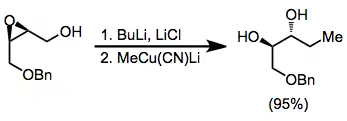 Under aprotic conditions, nucleophilic opening of epoxide isomers can be achieved with hydrides or organocuprates. Nucleophilic attack generally takes place at the least substituted carbon, yielding the more substituted diol product.[10]
