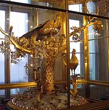 The Peacock egg was inspired by the 18th-century Peacock Clock made by James Cox. The clock was a present from Grigory Potemkin to Catherine the Great.[2] The Peacock Clock was housed in the Winter Palace in Saint Petersburg, Russia, which is now the Hermitage Museum.