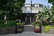 The Peacock Inn is a historic restaurant and inn in Princeton, New Jersey. The building itself dates to the 18th century and was originally located at the corner of Nassau Street and University Place. During the American Revolution it was the home of Jonathan Deare, and played host to members of the Continental Congress when they met in nearby Nassau Hall. It was moved to its current location in 1875 by famed archaeologist and Olympic athlete William Libbey.[4] Joseph and Helen O'Conner purchased the property in 1911 and opened the Peacock Inn, naming it after an inn in Derbyshire, England. The Inn has 16 guest rooms but is most known for its restaurant, consistently rated one of the finest in the state.[5]