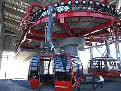 On August 29 and 30, the two ends of the haul rope were spliced together in a 220-foot (67 m) braid to form a continuous loop that could pull the cabins. The splice was performed by Norm Duke of Wyoming, who is one of only a few splicers in North America. The splicing process took 14 workers from Whistler-Blackcomb and Doppelmayr Garaventa over 15 hours to complete.[13] The 28 sky cabins arrived in Whistler starting on August 26.[14] The first twelve cabins crossed the span on September 19, 2008 with a single Doppelmayr engineer, Mathias Zudrell, aboard.[15] The remaining cabins were put on line and the system underwent extensive testing until its Grand Opening on December 12, 2008.